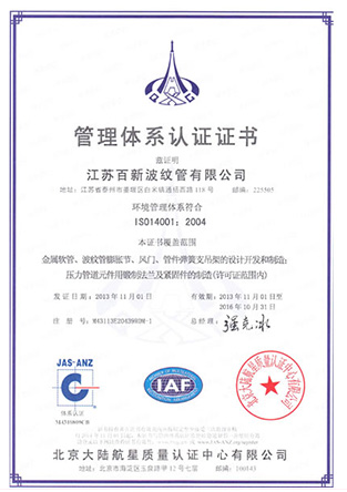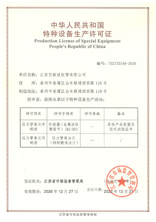 江蘇百新波紋管有限公司是特種設備(壓力管道元件)B1級許可制造單位,專業生產金屬軟管、波紋膨脹節、旋轉補償器、套筒補償器、球形補償器、彈簧支吊架等壓力管道元件。公司是中石化、中石油、中海油推薦產品配供定點企業,在行業是全國聯合會常務理事單位、中國石油化工設備協會膨脹節分會會員,中國壓力容器學會會員,中國機械工程學會壓力容器分會膨脹節專業委員會會員單位。 我公司產品的設計計算嚴格按照美國膨脹節制造商協會《EJMA》、GB/T12777-2019《金屬波紋管膨脹節通用技術條件》、GB/T16749-2018《壓力容器波形膨脹節》